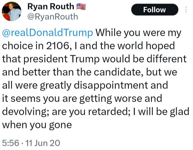 In a tweet shared in June 2020, Routh wrote: “@realDonaldTrump While you were my choice in 2106, I and the world hoped that president Trump would be different and better than the candidate, but we all were greatly disappointment and it seems you are getting worse and devolving; are you retarded; I will be glad when you gone”.