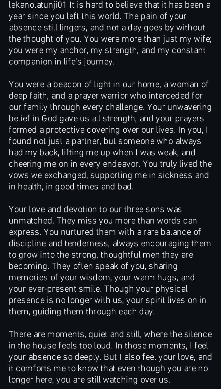 Lekan stated that as they honor her memory, they are celebrating the meaningful life that she lived as she would forever remain in their hearts.