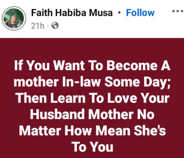 “If You Want To Become A mother In-law Some Day; Then Learn To Love Your Husband Mother No Matter How Mean She's To You,” she wrote in a Facebook post on Tuesday.