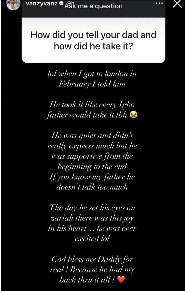 According to Vanessa, her father reacted in a manner typical of an Igbo father, staying quiet and not expressing much outward emotion. However, she noted that despite his initial silence, he was supportive throughout her entire journey.
