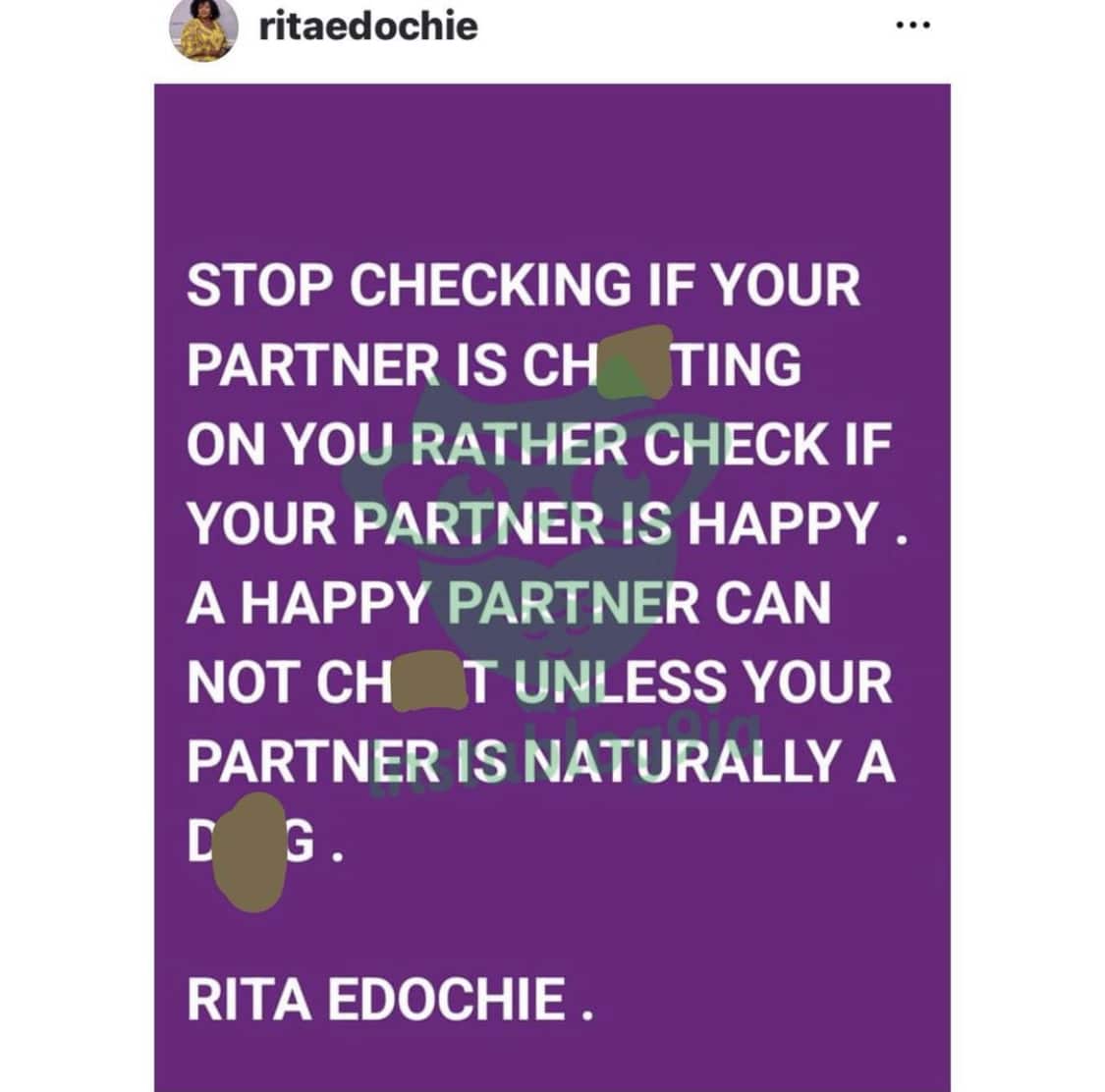 Rita Edochie wrote that instead of checking their partner’s phone to see if the person is cheating, couples should check and see if the other person is happy.