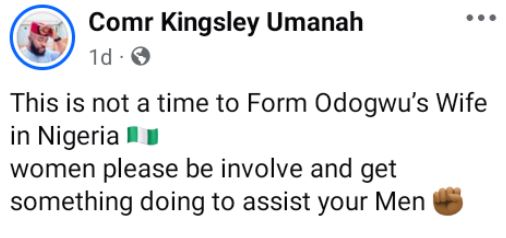 "This is not a time to form Odogwu’s Wife in Nigeria. Women please be involved and get something doing to assist your Men," he wrote in a Facebook post on Tuesday.