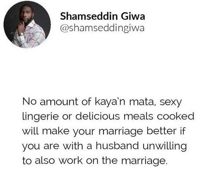 A Nigerian marriage therapist, Shamseddin Giwa has opined that no amount of aphrodisiac, cooked meals and lingerie can make a marriage better.