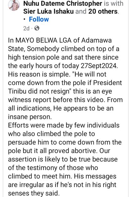 A young man in Mayobelwa local government area of Adamawa State on Friday caused a stir when he climbed a high-tension power pole and threatened to jump down if the leader of the Country failed to step aside. pic.twitter.com/2c6NLi2bKp