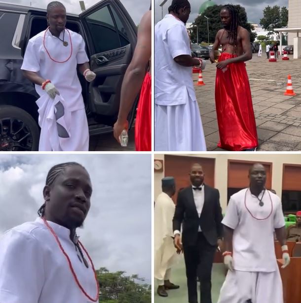 Dressed in his Benin apparel, he was accompanied by his lawyer, Deji Adeyanju.