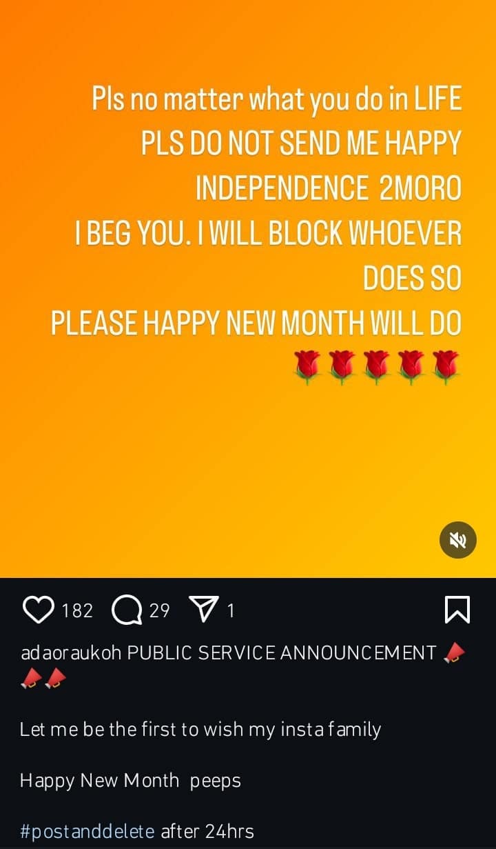 “Pls, no matter what you do in Life, please do not send me Happy Independence 2moro, I beg you. I will block whoever does so. Please, Happy New Month will do.