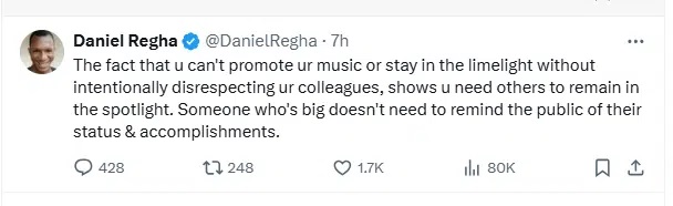 “The fact that u can’t promote ur music or stay in the limelight without intentionally disrespecting ur colleagues, shows u need others to remain in the spotlight. Someone who’s big doesn’t need to remind the public of their status & accomplishments.”