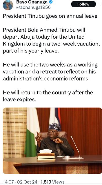 The statement shared by Onanuga reads: "President Bola Ahmed Tinubu will depart Abuja today for the United Kingdom to begin a two-week vacation, part of his yearly leave.