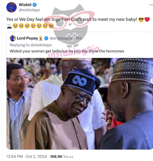 Lord Popey said: “@wizkidayo Wizkid your woman get belle but na you the show hormones”