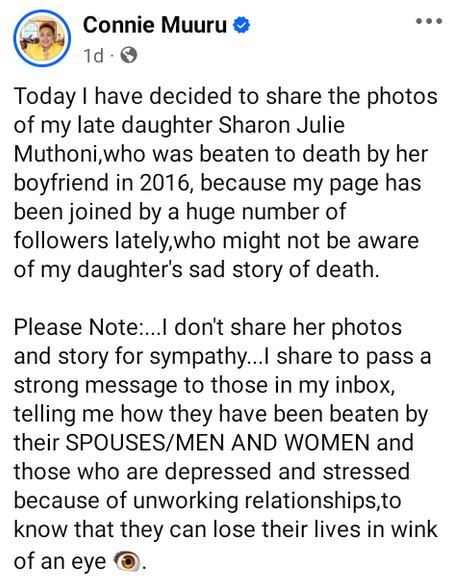 "Today I have decided to share the photos of my late daughter Sharon Julie Muthoni,who was beaten to death by her boyfriend in 2016, because my page has been joined by a huge number of followers lately, who might not be aware of my daughter's sad story of death," she wrote in a Facebook post on Wednesday, October 2.