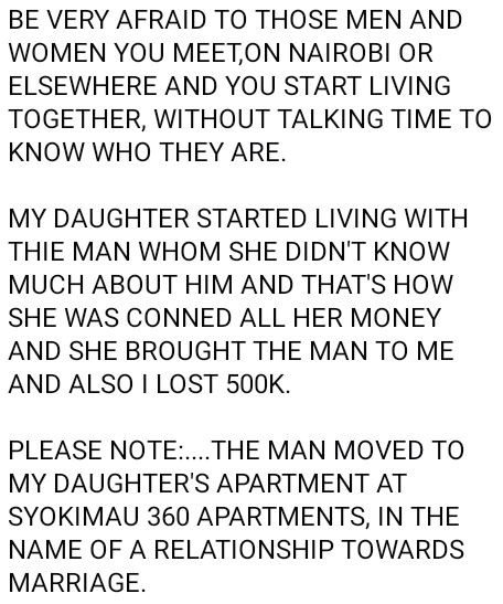 BE VERY AFRAID TO THOSE MEN AND WOMEN YOU MEET,ON NAIROBI OR ELSEWHERE AND YOU START LIVING TOGETHER, WITHOUT TALKING TIME TO KNOW WHO THEY ARE.