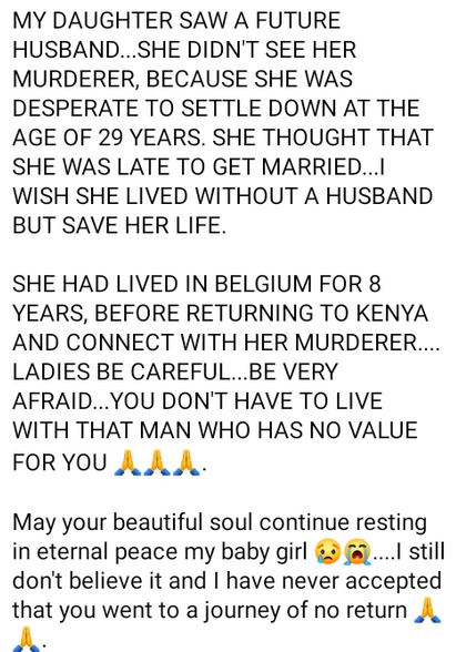 SHE HAD LIVED IN BELGIUM FOR 8 YEARS, BEFORE RETURNING TO KENYA AND CONNECT WITH HER MURDERER.... LADIES BE CAREFUL...BE VERY AFRAID...YOU DON'T HAVE TO LIVE WITH THAT MAN WHO HAS NO VALUE FOR YOU .