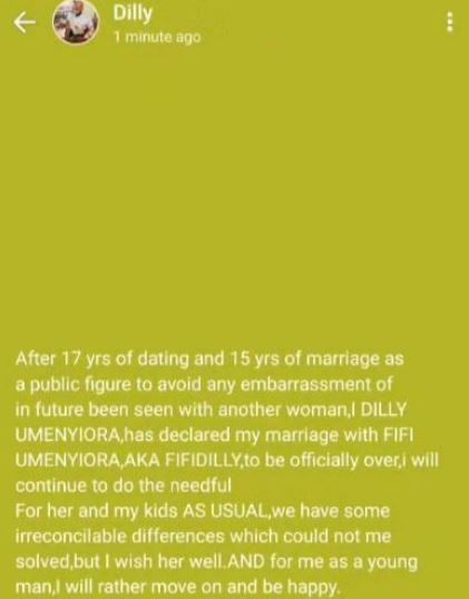 In December 2023, businessman Dilly announced that he is no longer with Fifi, his wife of 15 years and mother of his 3 children.