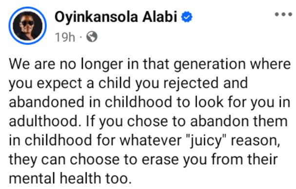 "If you chose to abandon them in childhood for whatever "juicy" reason, they can choose to erase you from their mental health too," she wrote in a Facebook post on Thursday.