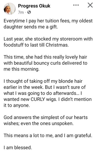 In a Facebook post, she recalled how her daughter stocked her storeroom with foodstuffs and also got her a curly wig this morning.