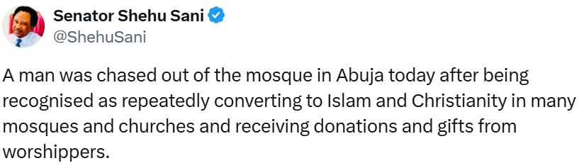 Sani tweeted; “A man was chased out of the mosque in Abuja today after being recognised as repeatedly converting to Islam and Christianity in many mosques and churches and receiving donations and gifts from worshippers.”