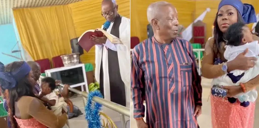 The couple’s celebration, captured in a video shared by TikTok user @ese.nice78, shows them dancing with gratitude as they dedicate their baby in church.