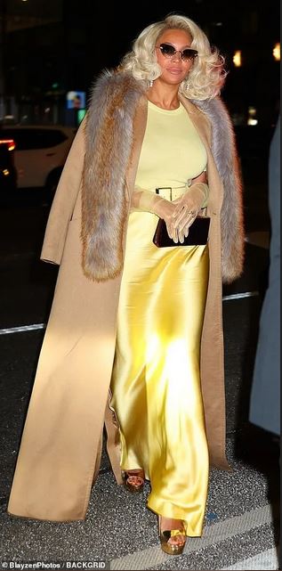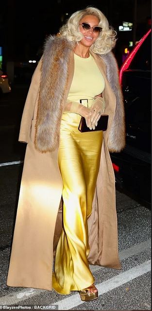 She strolled the venue in sky-high gold platform shoes and with a luxurious fur-lined coat draped over her shoulders.