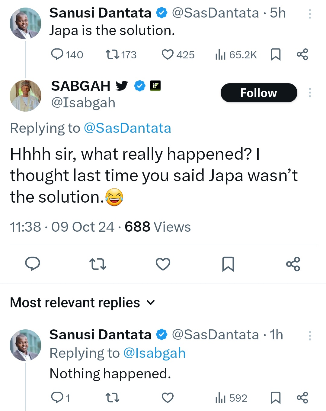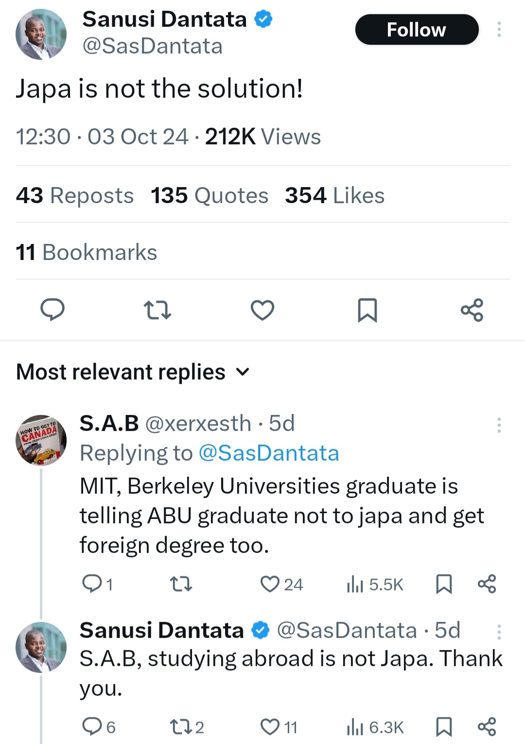 Six days ago, Sanusi Dantata, a graduate of MIT and UC Berkeley, both abroad, took to X to write: "Japa is not the solution!"