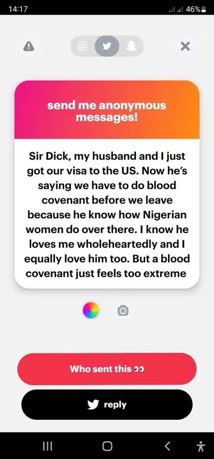 “My husband and I just got our visa to the US. Now he’s saying we have to do blood covenant before we leave because he know how Nigerian women do over there. I know he loves me wholeheartedly and I equally love him too. But a blood covenant just feels too extreme”
