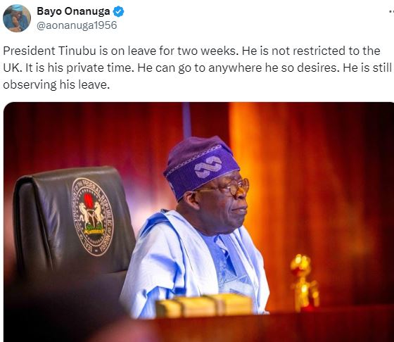 Responding to such critics, Onanuga wrote; ‘’President Tinubu is on leave for two weeks. He is not restricted to the UK.