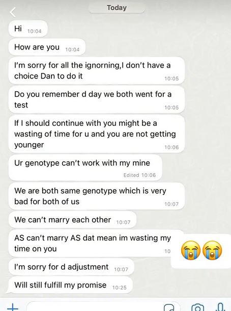 In the messages, her partner expressed regret, saying, “We are both same genotype which is very bad for both of us. We can’t marry each other. AS can’t marry AS dat means I’m wasting my time on you.”