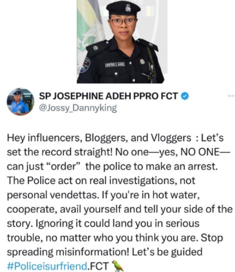 In a post shared on X, Adeh stated that the police acts on investigation and not on personal vendettas.