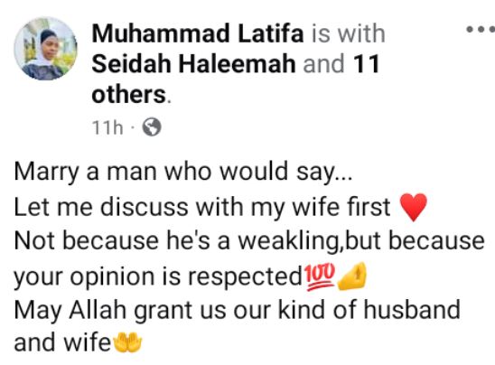 “Marry a man who would say…Let me discuss with my wife first. Not because he's a weakling, but because your opinion is respected. May Allah grant us our kind of husband and wife," she wrote.
