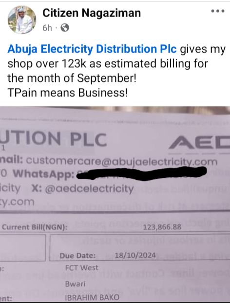 Nagaziman took to Facebook on Tuesday, October 16, to display the bill, saying his shop was charged N123,000 for the month of September.