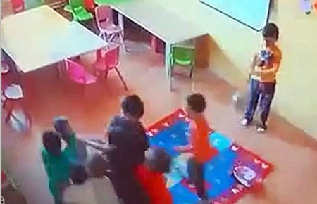 This is the shocking moment nursery children ganged up on their smallest classmate, pushing and hitting him after their teacher allegedly told them to 'beat up this child'.