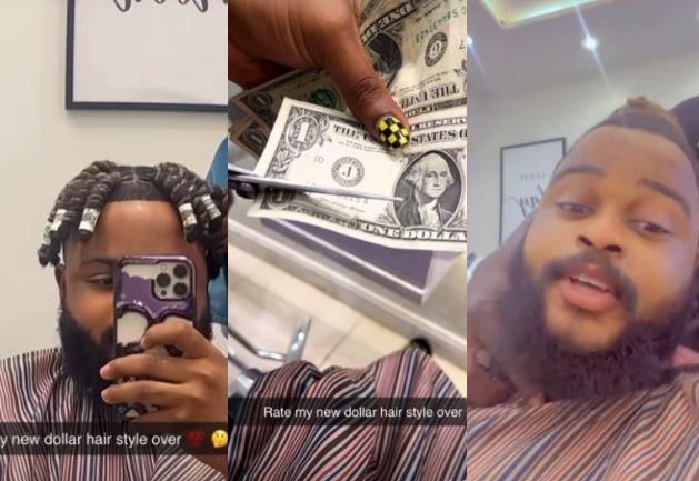 #WATCH!!!! Money na water,” - - - BBNaija Star, WhiteMoney, says as his hairdresser decorates his hair with dollar bills 💸.