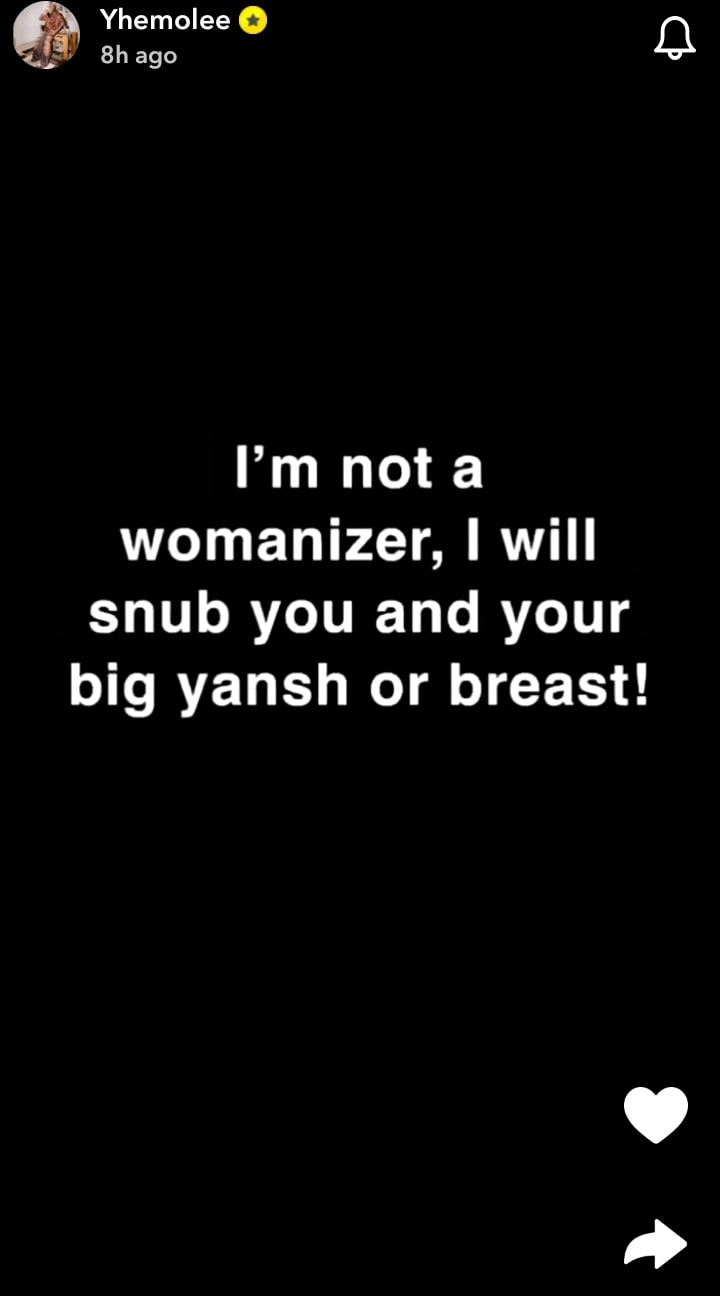 Nigerian singer and socialite Yhemo Lee has reacted to claims that he's a womanizer.