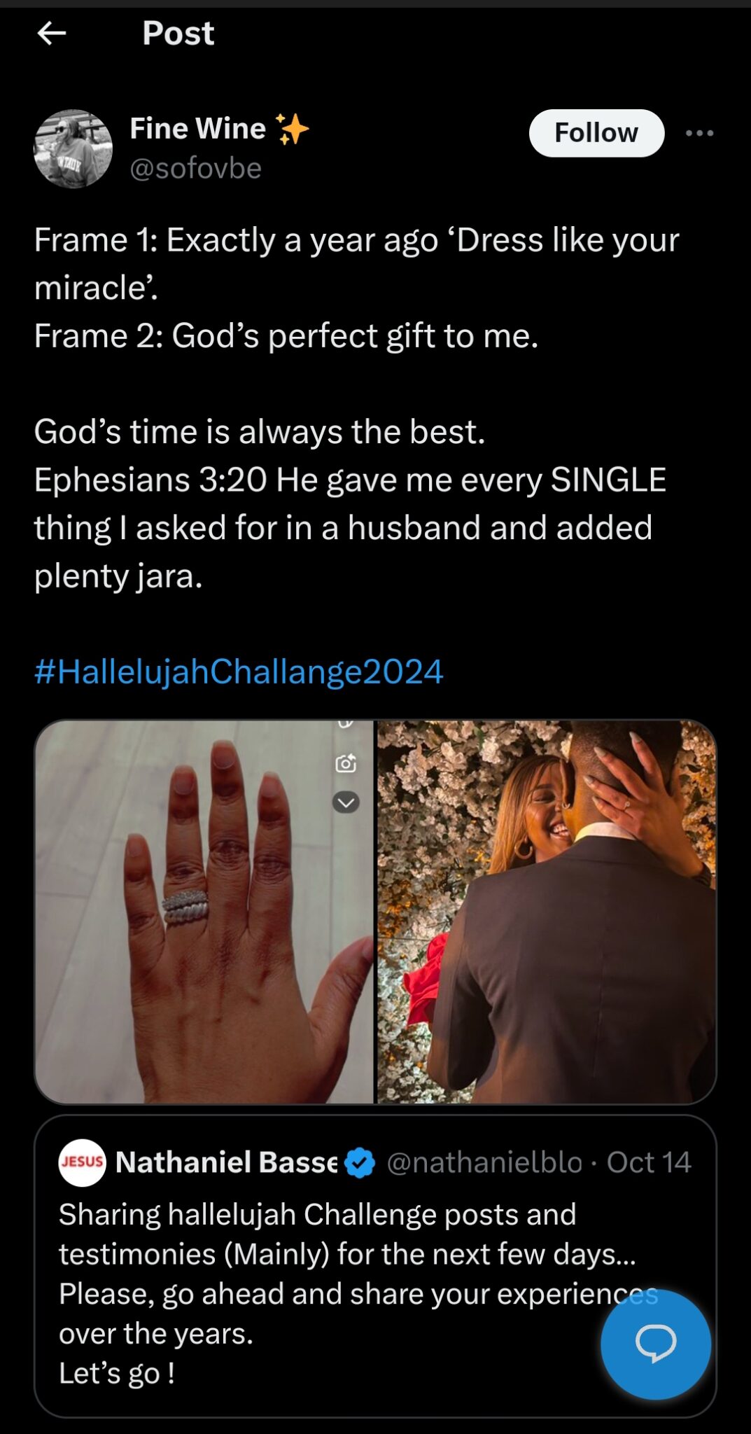 She took to X to share her story and wrote: “Frame 1: Exactly a year ago, ‘Dress like your miracle.’ Frame 2: God’s perfect gift to me.”