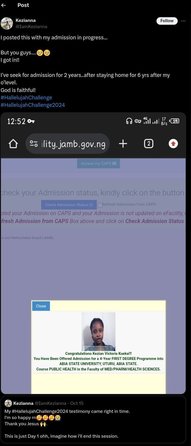 In her words: “I posted this with my admission still in progress. But you guys, I got in! I’ve been seeking admission for 2 years…after staying home for 6 years after my O’Level. God is faithful!”