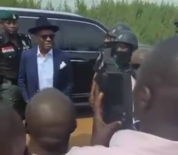 Wearing a blue suit and his signature bowler hat, Wike, visibly angry and surrounded by security personnel, lectured the residents on the proper procedure for acquiring land legally.