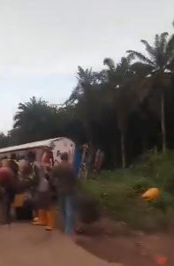 A group of people have been spotted in a viral video scooping fuel from a fallen tanker in Akamkpa, Cross River State.