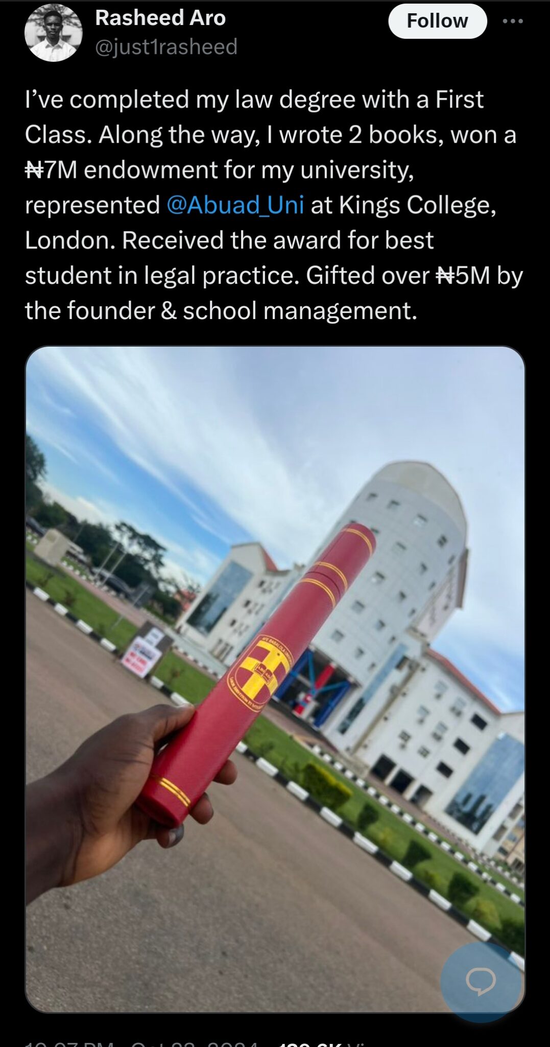 “I’ve completed my law degree with a First Class. Along the way, I wrote two books, won a ₦7 million endowment for my university, represented @Abuad_Uni at King’s College, London, and was awarded the best student in legal practice, receiving over ₦5 million from the founder and school management."