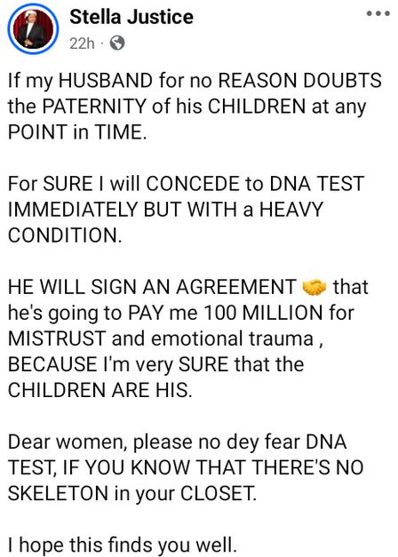 “If my HUSBAND for no REASON DOUBTS the PATERNITY of his CHILDREN at any POINT in TIME. For SURE I will CONCEDE to DNA TEST IMMEDIATELY BUT WITH a HEAVY CONDITION. HE WILL SIGN AN AGREEMENT that he's going to PAY me 100 MILLION for MISTRUST and emotional trauma BECAUSE I'm very SURE that the CHILDREN ARE HIS. Dear women, please no dey fear DNA TEST, IF YOU KNOW THAT THERE'S NO SKELETON in your CLOSET,” she wrote in a Facebook post on Thursday.