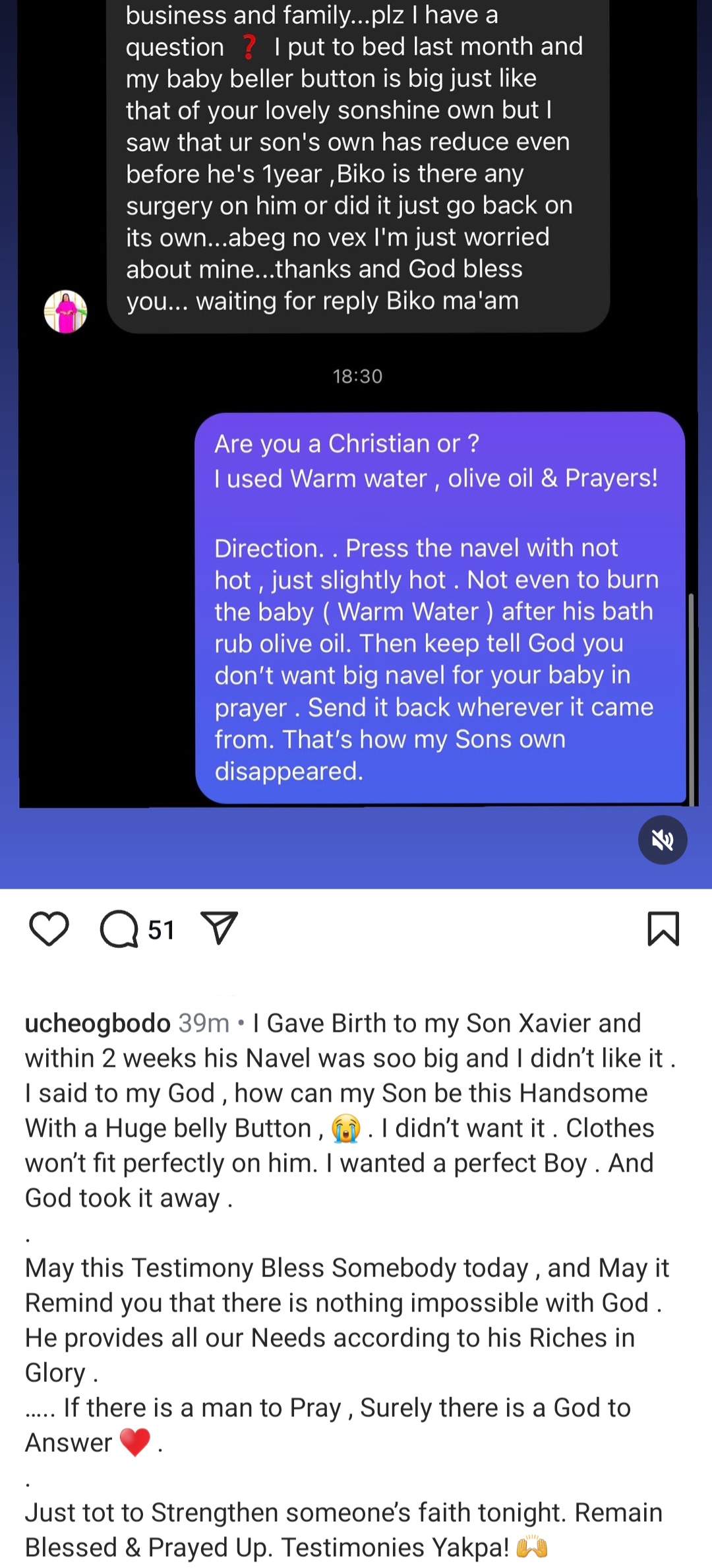 Uche added that she used warm water, olive oil, and prayers and that was how her son's belly button "disappeared".