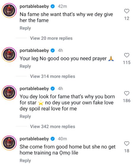 Popular Nigerian singer, Portable has taken to an Instagram post made by his fourth baby mama to call her out online.