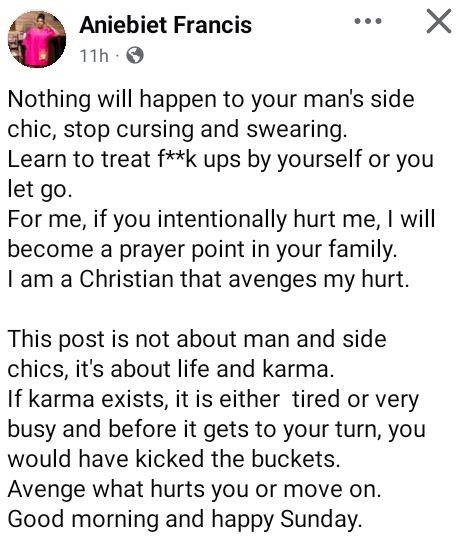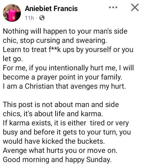 “For me, if you intentionally hurt me, I will become a prayer point in your family. I am a Christian that avenges my hurt. This post is not about man and side chics, it's about life and karma.