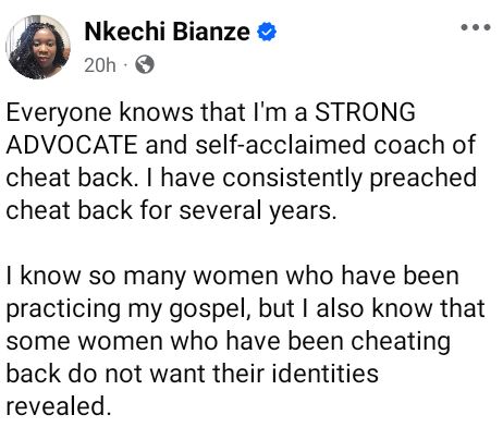 Continuing in another post, she wrote: "Someone said “Nkechi, you are asking women to cheat back. But you are not practicing it.”