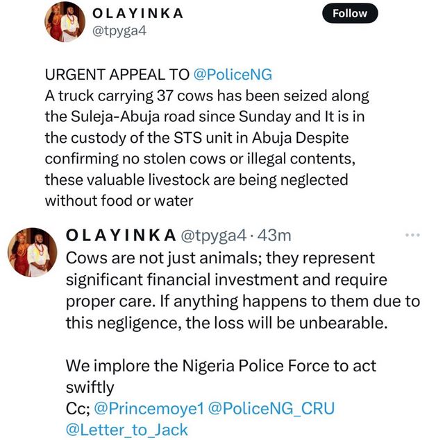 A Nigerian farmer, Olayinka has taken to the X platform to lament after men of the Nigerian police force allegedly impounded a truck conveying 37 cows.