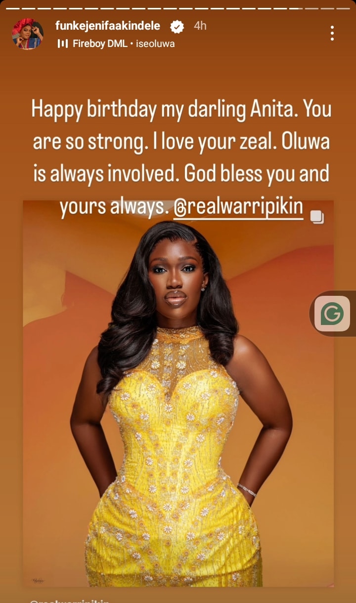 “Happy birthday my darling Anita. You are so strong. I love your zeal. Oluwa is always involved.God bless you and yours always.”