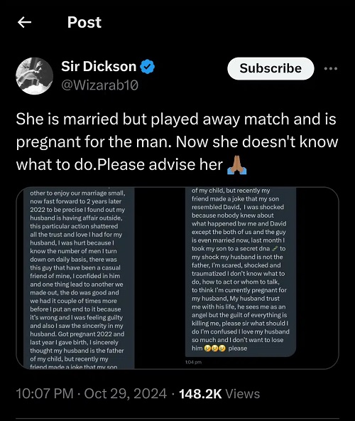 A married woman has taken to social media to seek for help after discovering that the man she had an affair with two years into her marriage is the biological father of her child, not her husband.