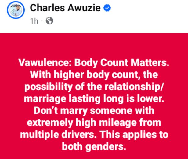 "Don’t marry someone with extremely high mileage from multiple drivers. This applies to both genders,” he wrote in a post on Friday.