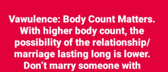 “Vawulence: Body Count Matters. With higher body count, the possibility of the relationship/marriage lasting long is lower.