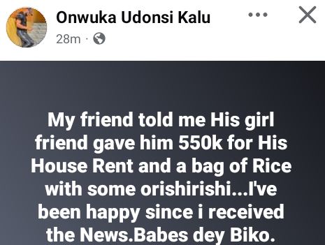 “My friend told me His girl friend gave him 550k for His House Rent and a bag of Rice with some orishirishi...I've been happy since I received the News. Babes dey Biko,” he wrote.