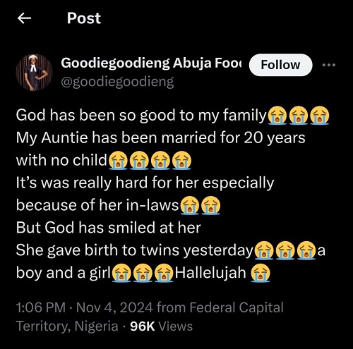 “God has been so good to my family! 😭😭😭 My Auntie has been married for 20 years with no child. It was really hard for her, especially because of her in-laws. 😭😭 But God has smiled at her. She gave birth to twins yesterday—a boy and a girl! 😭😭😭 Hallelujah!”