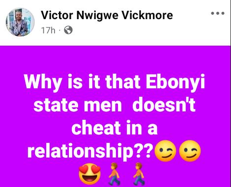 Some men from Ebonyi state man have opined that they are always faithful in relationships.